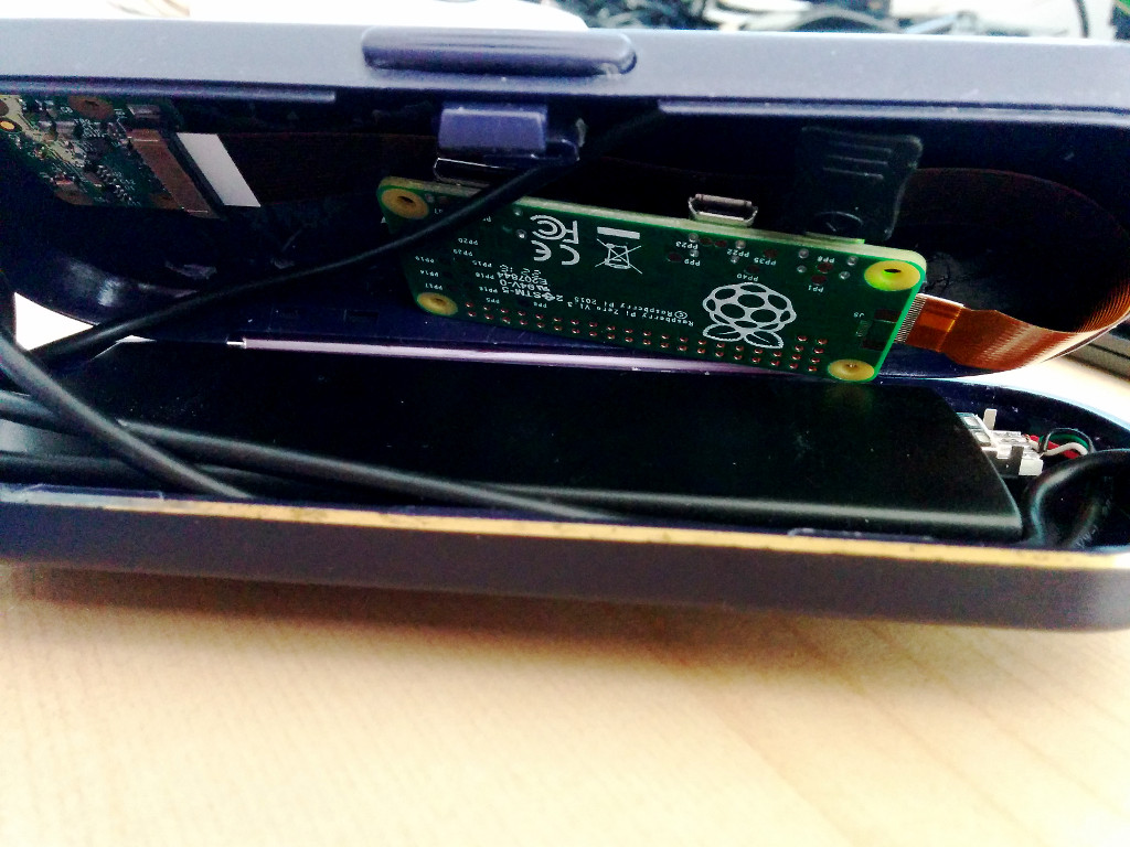 Un problĂšme : la camĂ©ra se connecte via un cĂąble plat au port camĂ©ra du Pi Zero. Ce cĂąble est court et utilise un connecteur plus Ă©troit. Donc le Pi Zero et la camĂ©ra doivent ĂȘtre logĂ©s ensemble dans la partie portable.